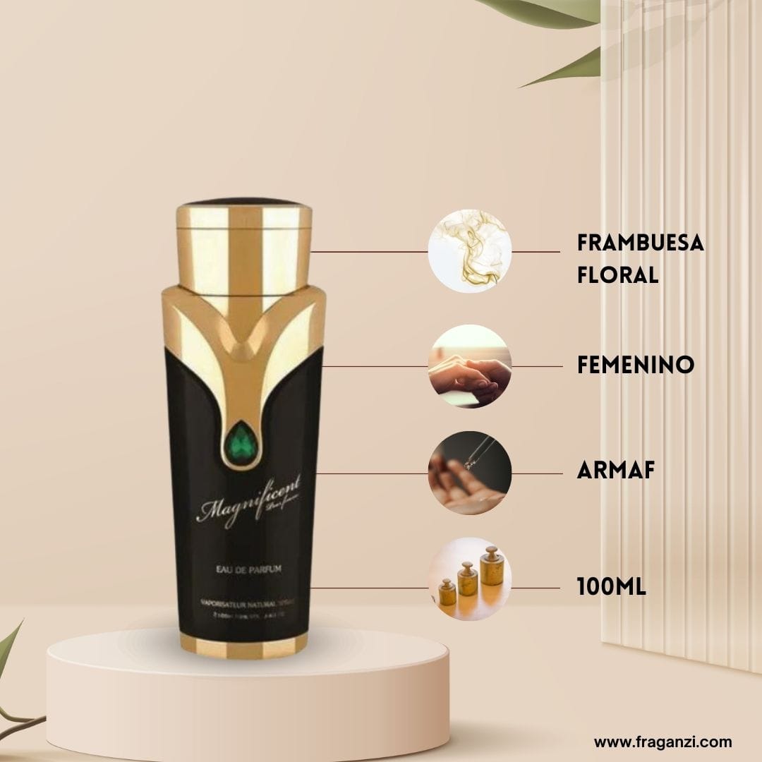 O Magnificent Pour Femme da Armaf é uma fragrância feminina que se inspira no icônico Sí da Giorgio Armani. Essa interpretação oferece uma experiência olfativa envolvente e sofisticada, capturando a essência floral amadeirada do perfume original.
